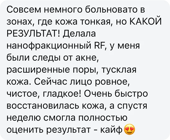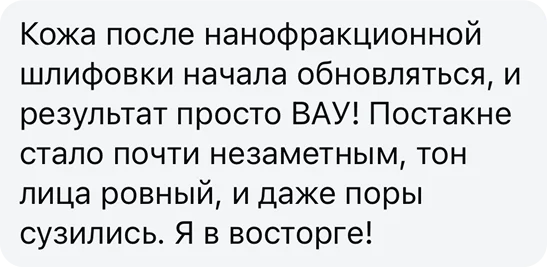Если вы хотите вернуть коже ровность, гладкость и свежесть, обратите внимание на нанофракционную RF-шлифовку — это современный способ помочь вашей коже обновиться. Процедура аккуратно работает с текстурой и тоном, устраняет следы от акне, делает морщины менее заметными и возвращает коже упругость. Безболезненно, безопасно и с минимальным восстановлением. Теперь ваша история — только в ваших руках.