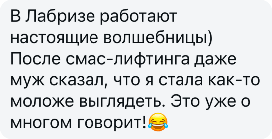 Овал лица подтягивается и становится более четким Улучшается тонус, повышается упругость кожи Становится меньше морщин и заломов Приподнимаются брови и уголки губ Выравнивается тон и текстура кожи Лицо выглядит моложе